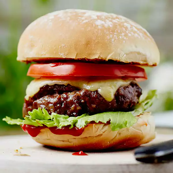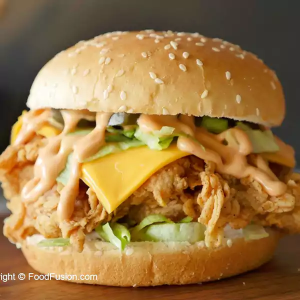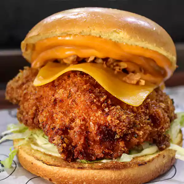 Spicy Marinated Chicken Glazed In Classic Cheddar With Homemade Sauce Served On Supreme Bun With Lettuce & Tomatoes