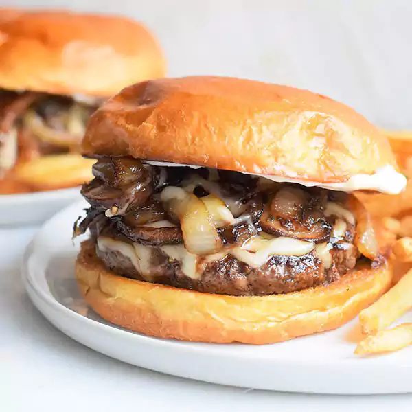 Grilled Angus Beef Patty, Spanish Onions, Mushroom Glaze &montery Jack Cheese, Spinners Signature Sauce Bread On Supreme Bun