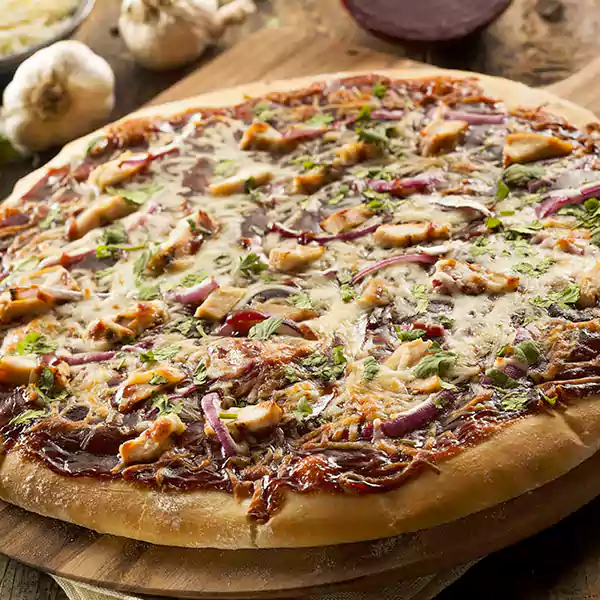 Pizza Loaded With Pepperoni, Roasted Chicken, Red Onion, Mushrooms, Bell Peppers & Black Olives
