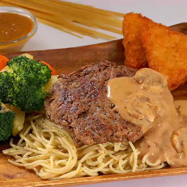 Juicy Grilled Beef Tenderloin Steaks Served With Pasta Choice Of Two Side Dishes, Demiglaze Mushroom Sauce